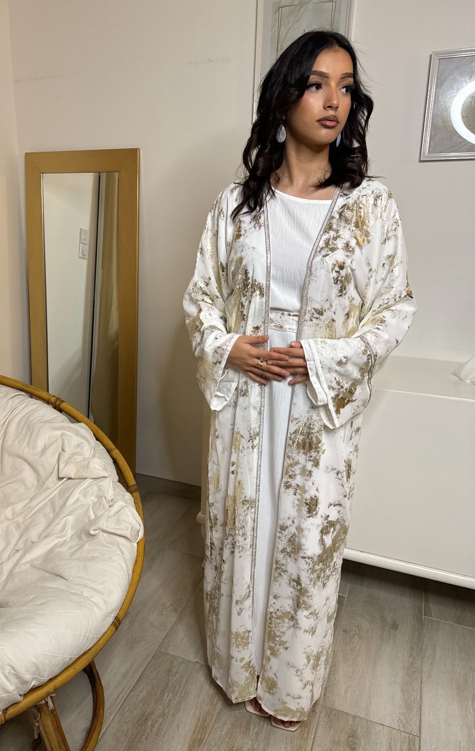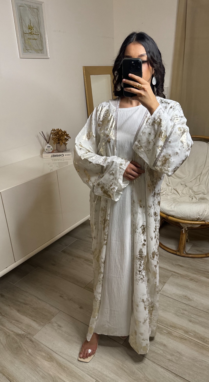 Son kimono Nidah Sa sous robe Son châle en mousseline assorti Avec une ceinture à nouer Précautions d’usage de votre Abaya Émiratie : Lavage main de préférence Laver avec des couleurs similaires uniquement Pas de séchage au sèche linge. Suspendre sur cintre pour sécher Repassage doux programme vapeur à l’envers uniquement MADE IN UAE TAILE: […]