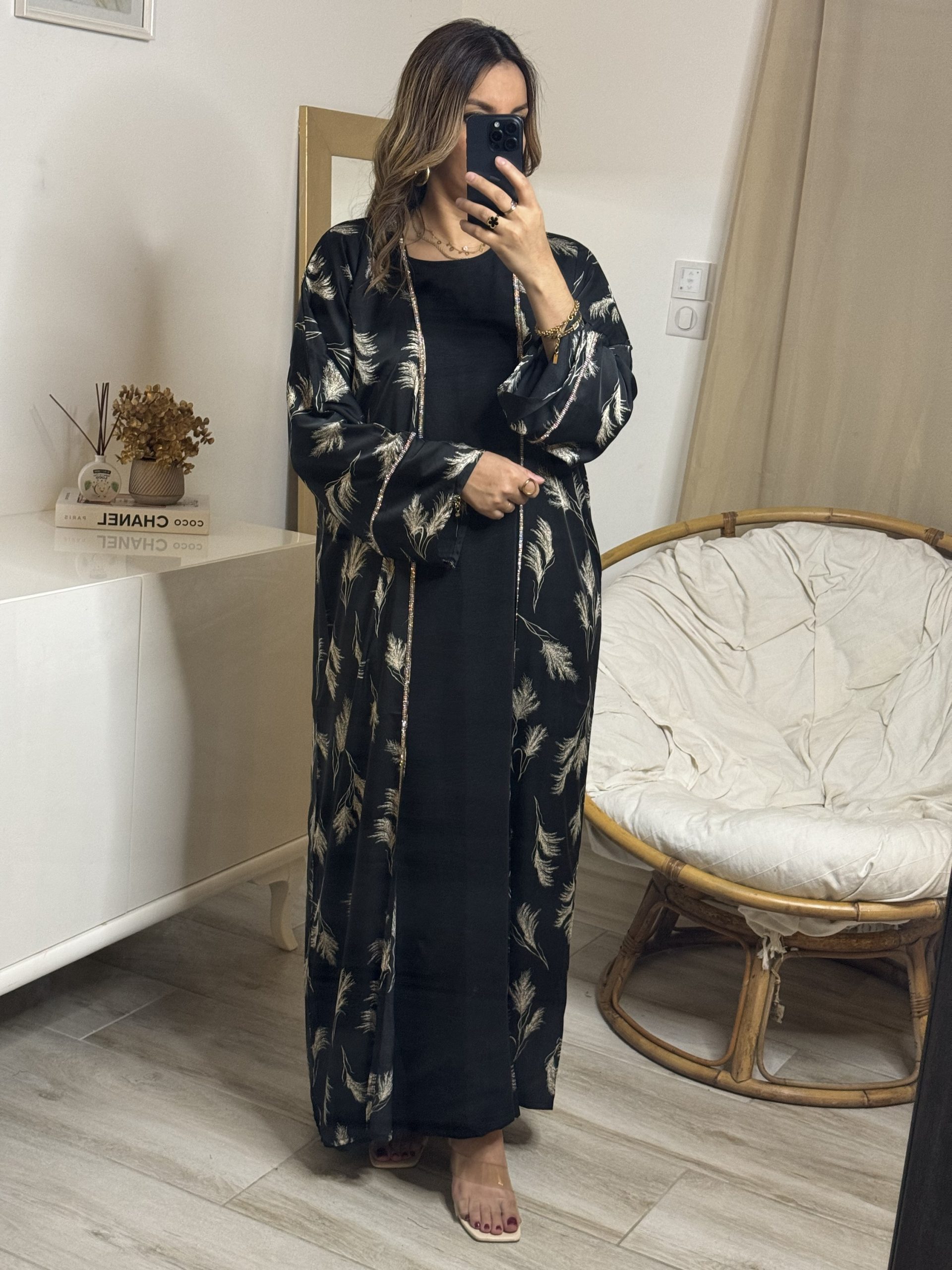 Son kimono de soie Sa sous robe en jazz à manches courtes Son châle en mousseline assorti Avec une ceinture à nouer Précautions d’usage de votre Abaya Émiratie : Lavage main de préférence Laver avec des couleurs similaires uniquement Pas de séchage au sèche linge. Suspendre sur cintre pour sécher Repassage doux programme vapeur à l’envers uniquement TAILLE: 54 Entre […]