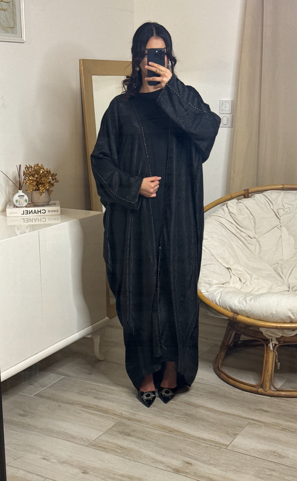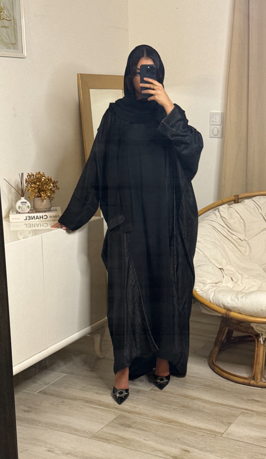 Son kimono noir de Nidah Sa sous robe en jazz à manches courtes Son châle en mousseline assorti Avec une ceinture à nouer noir Précautions d’usage de votre Abaya Émiratie : Lavage main de préférence Laver avec des couleurs similaires uniquement Pas de séchage au sèche linge. Suspendre sur cintre pour sécher Repassage doux programme vapeur à l’envers uniquement MADE IN UAE […]