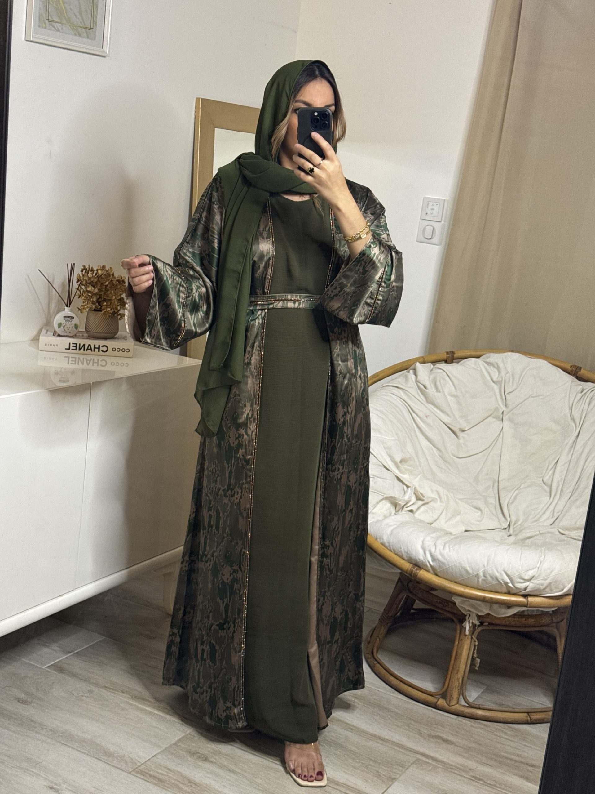 Son kimono Nidah Sa sous robe à manches courtes Son châle en mousseline assorti Avec une ceinture à nouer Précautions d’usage de votre Abaya Émiratie : Lavage main de préférence Laver avec des couleurs similaires uniquement Pas de séchage au sèche linge. Suspendre sur cintre pour sécher Repassage doux programme vapeur à l’envers uniquement MADE […]