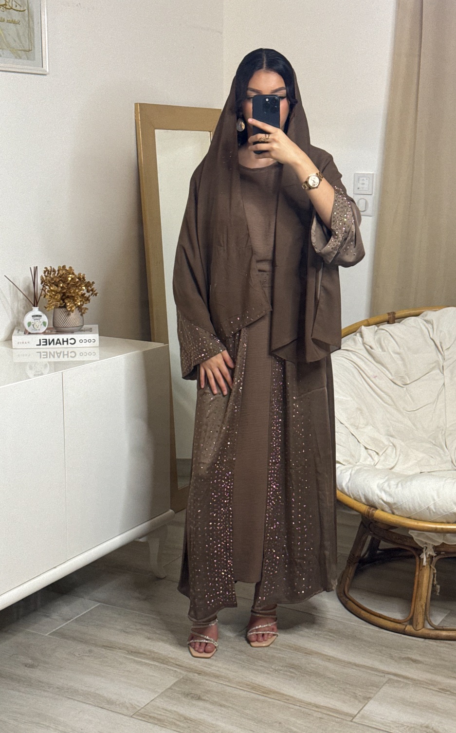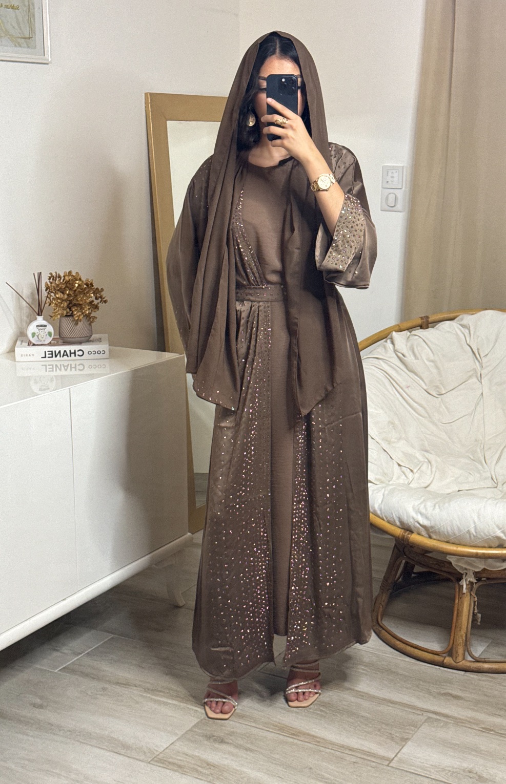 Son kimono Nidah Sa sous robe à manches courtes Son châle en mousseline assorti Avec une ceinture à nouer Précautions d’usage de votre Abaya Émiratie : Lavage main de préférence Laver avec des couleurs similaires uniquement Pas de séchage au sèche linge. Suspendre sur cintre pour sécher Repassage doux programme vapeur à l’envers uniquement MADE IN UAE TAILLE: 54 […]