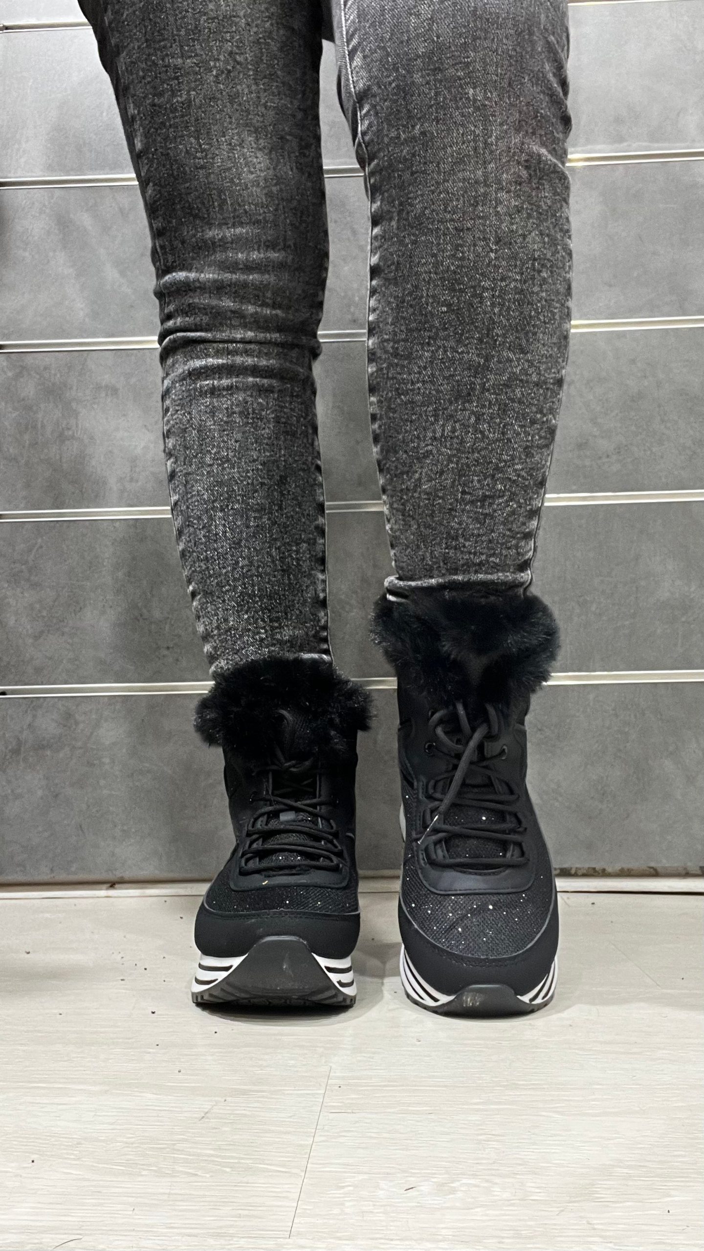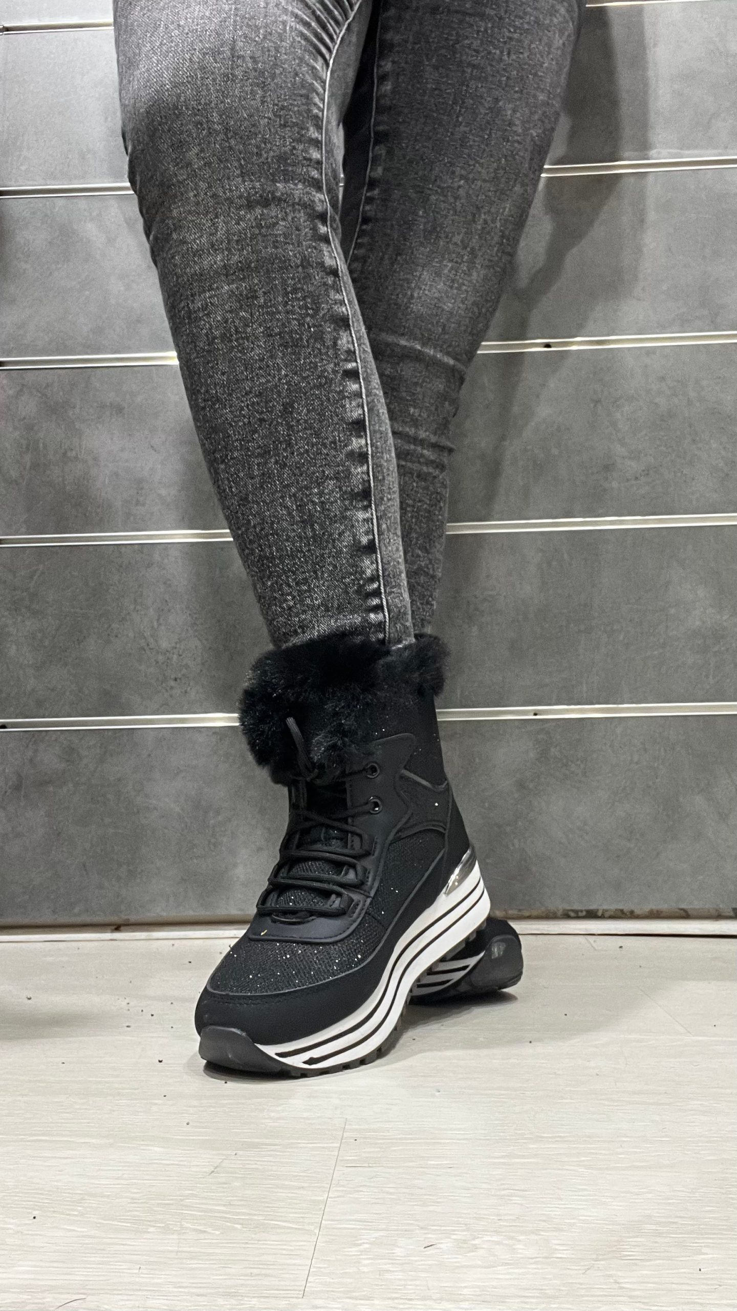 Ajoute une touche de glamour à tes looks d’hiver avec cette basket montante noire ornée de paillettes discrètes !