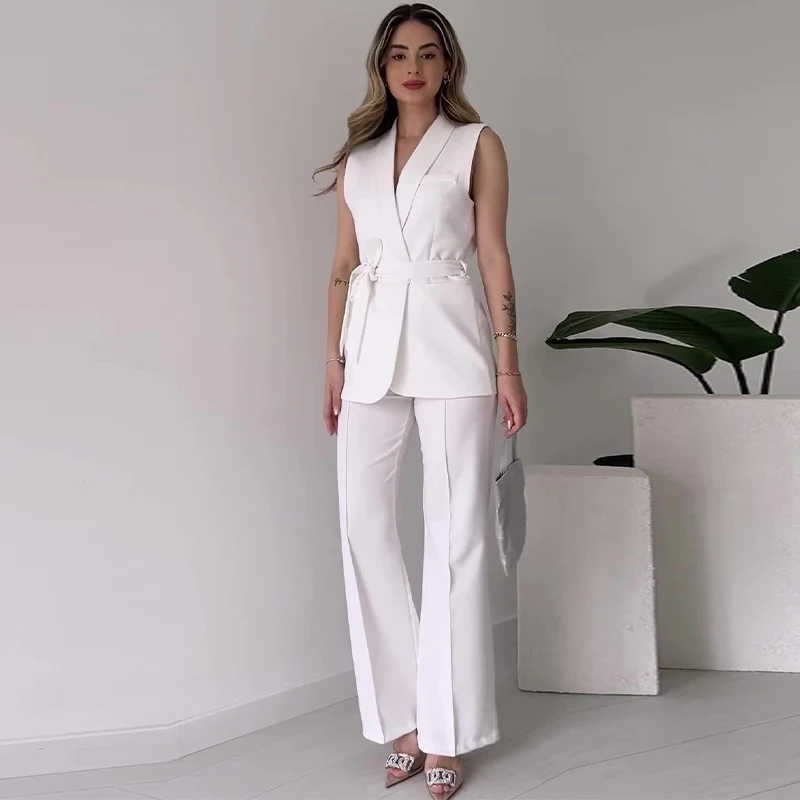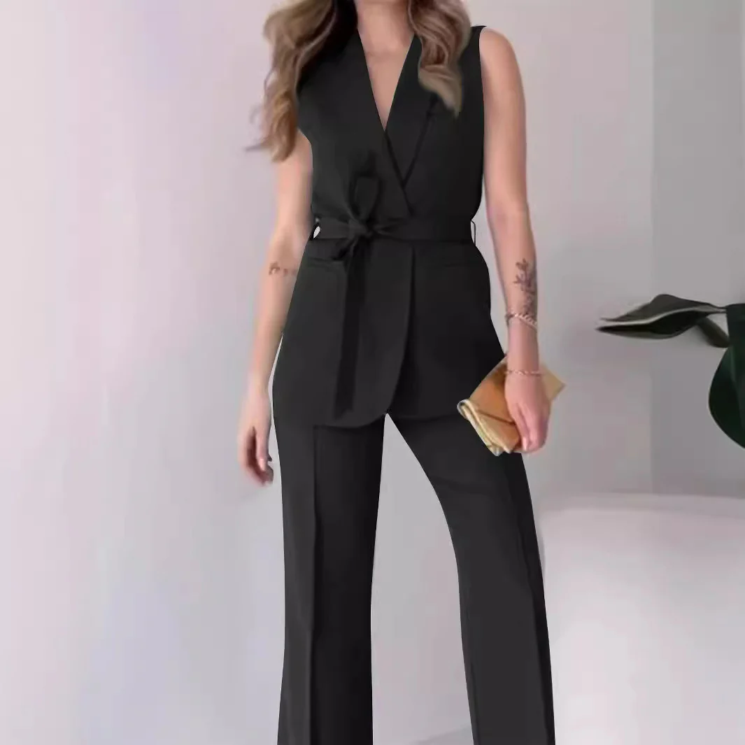 Adoptez un style à la fois élégant et décontracté avec cet ensemble féminin composé d’un haut sans manches et d’un pantalon fluide. Conçu en polyester léger, il offre une liberté de mouvement optimale tout en restant confortable pour vos journées actives.