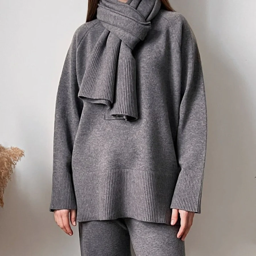 Son design minimaliste à couleurs unies – gris, kaki ou marron – permet de créer un look harmonieux en un clin d’œil. Le haut, le pantalon et l’écharpe se coordonnent parfaitement pour un style soigné et décontracté.