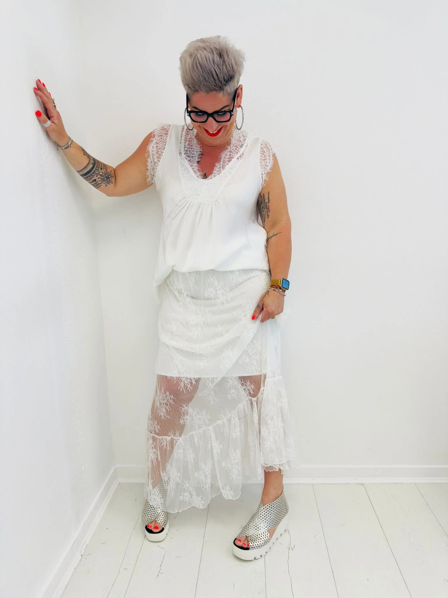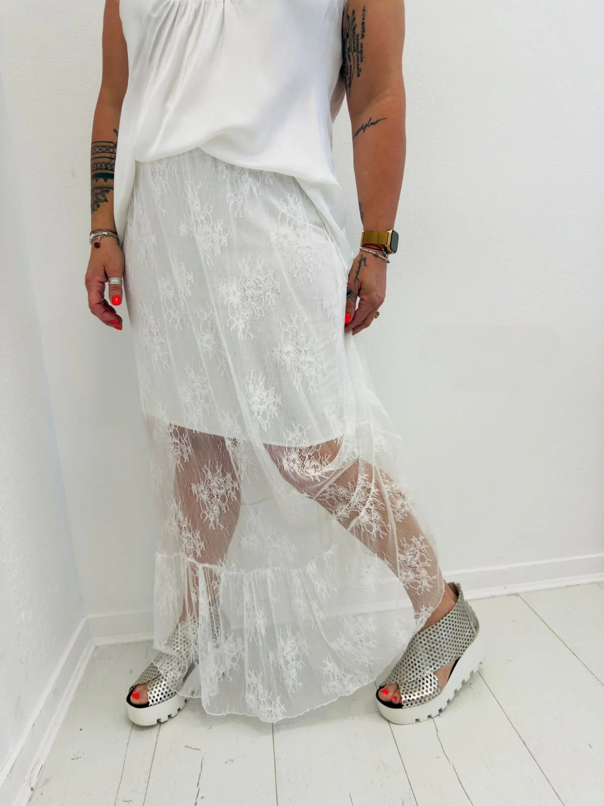 Elle est composée d’une doublure qui s’arrête au niveau du genou, assurant confort et discrétion, et d’un tissu transparent brodé qui descend jusqu’aux chevilles. Le contraste entre la doublure opaque et la transparence du voile crée un effet chic et aérien, idéal pour sublimer vos courbes sans les contraindre.