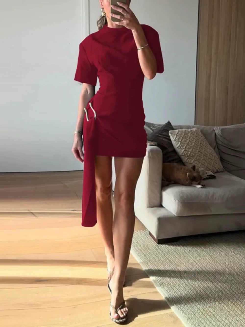 Préparez-vous à faire sensation avec cette mini-robe en maille ponte avec des manches courtes exagérées et une ceinture drapée fixée par du matériel de déclaration ajoutant de la dimension à la silhouette ajustée.