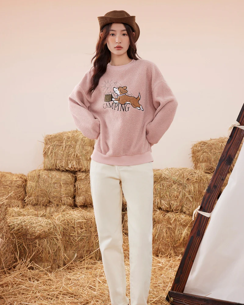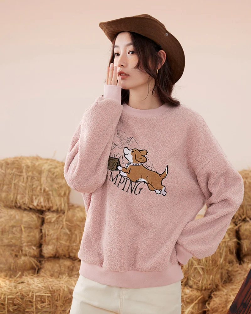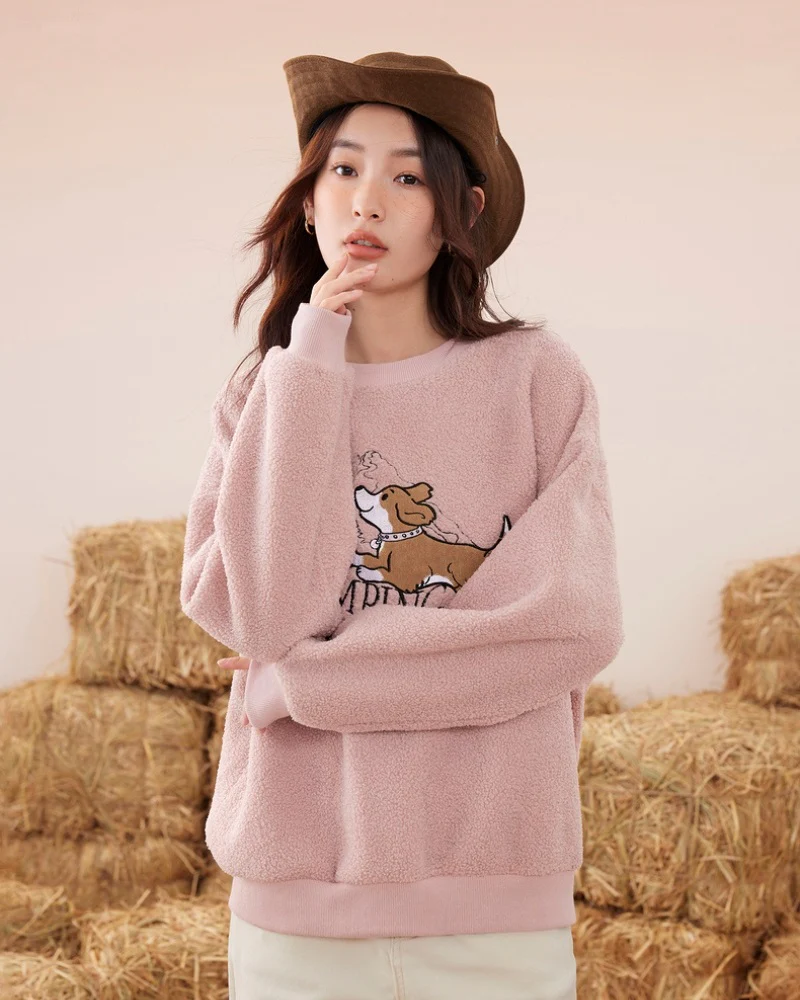 Pull en matière Pilou Pilou de couleur rose avec motif amusant