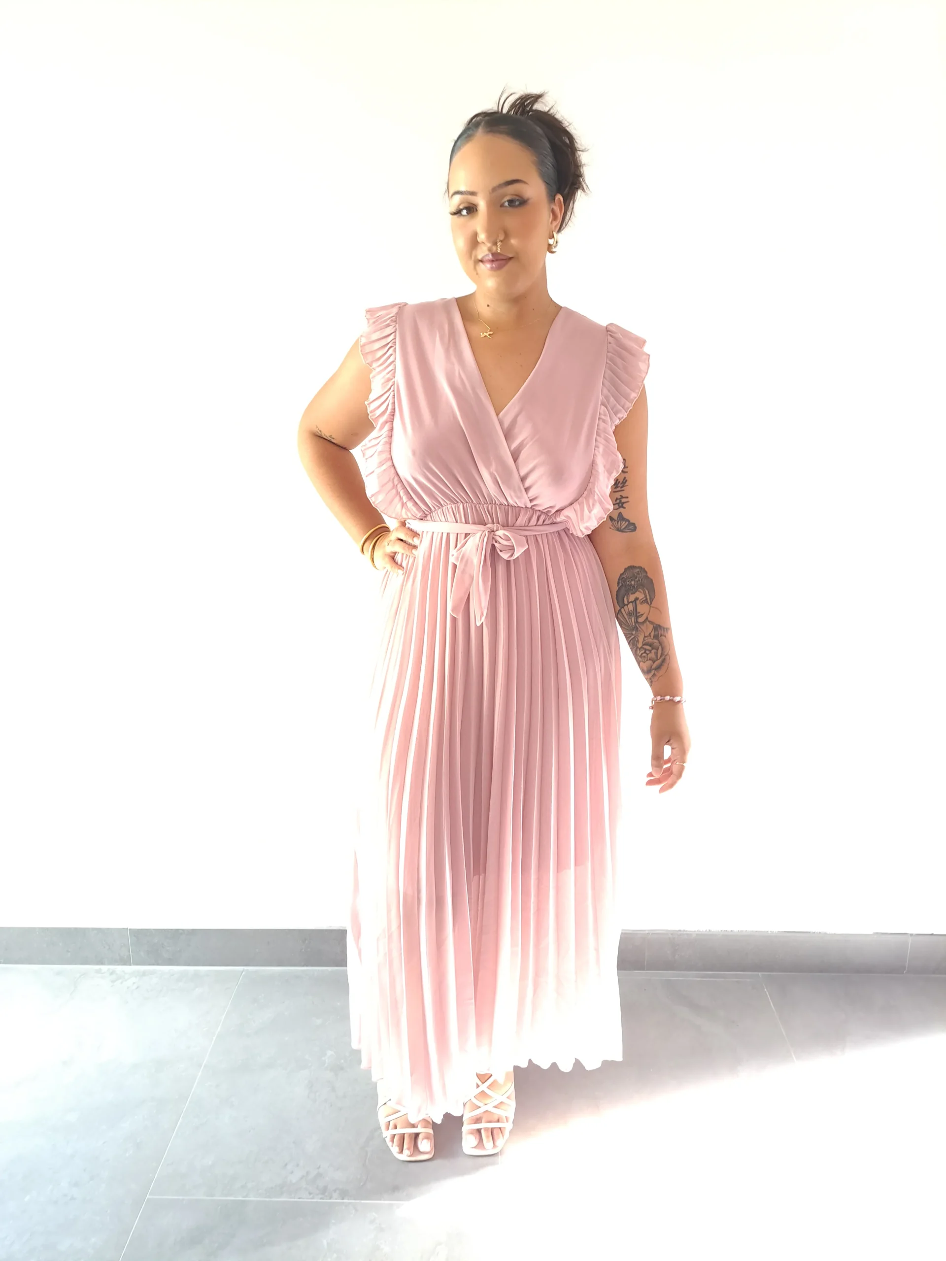 Un dîner romantique ? Un cocktail en bord de plage ? Une soirée entre copines ? La robe blush plissée se prête à tous les jeux. Elle s’associe parfaitement à des talons pour une allure sophistiquée ou à des sandales pour une touche décontractée. Une tenue polyvalente, tout comme vous !