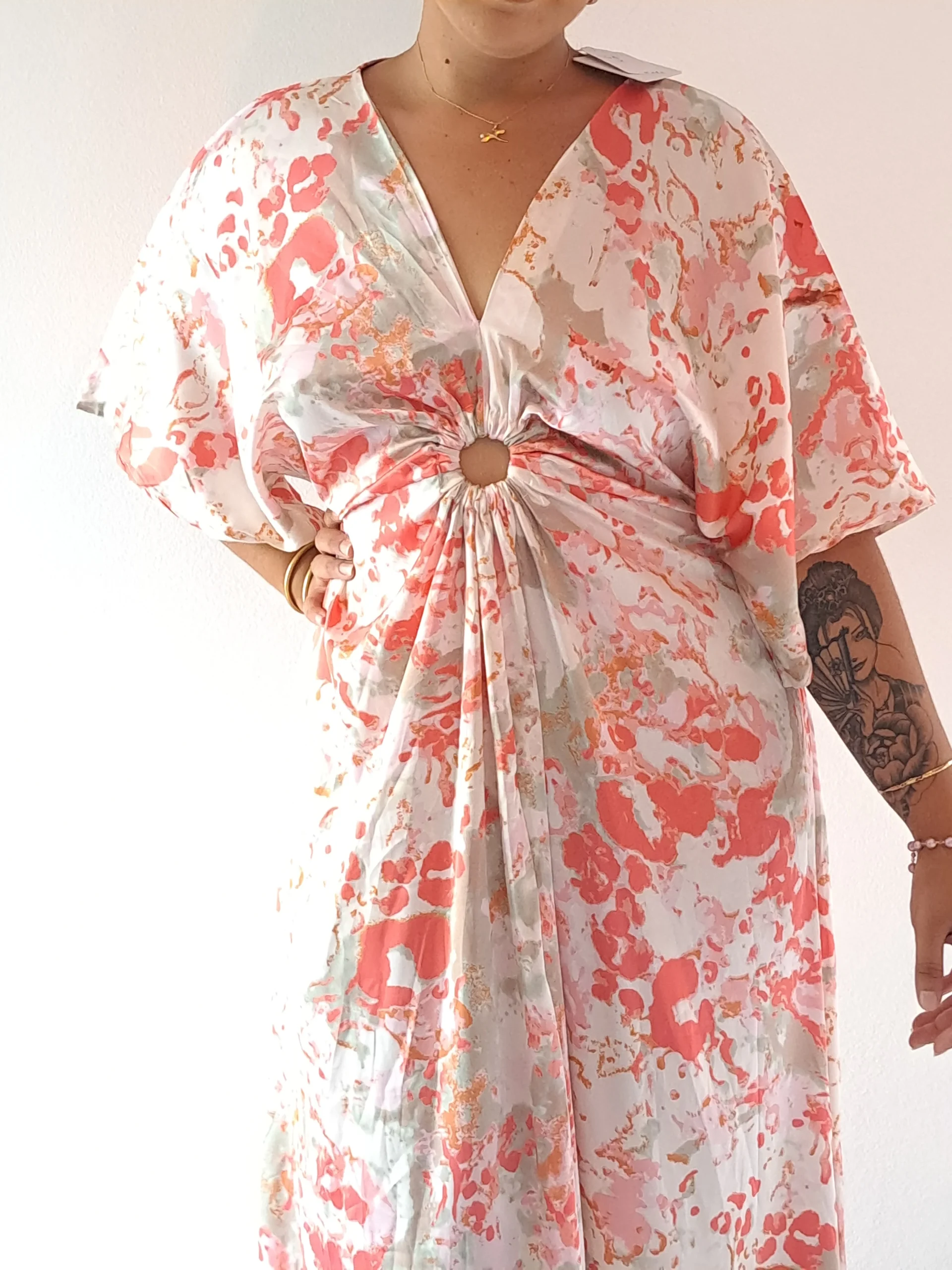 Les nuances corail de cette robe satinée apportent instantanément luminosité et éclat à votre teint. Cet imprimé vibrant évoque les chaudes journées d’été et les soirées douces en bord de mer. Sa palette chromatique polyvalente se marie parfaitement avec des accessoires dorés pour une allure sophistiquée, ou avec des pièces naturelles en raphia pour un style plus bohème-chic.
