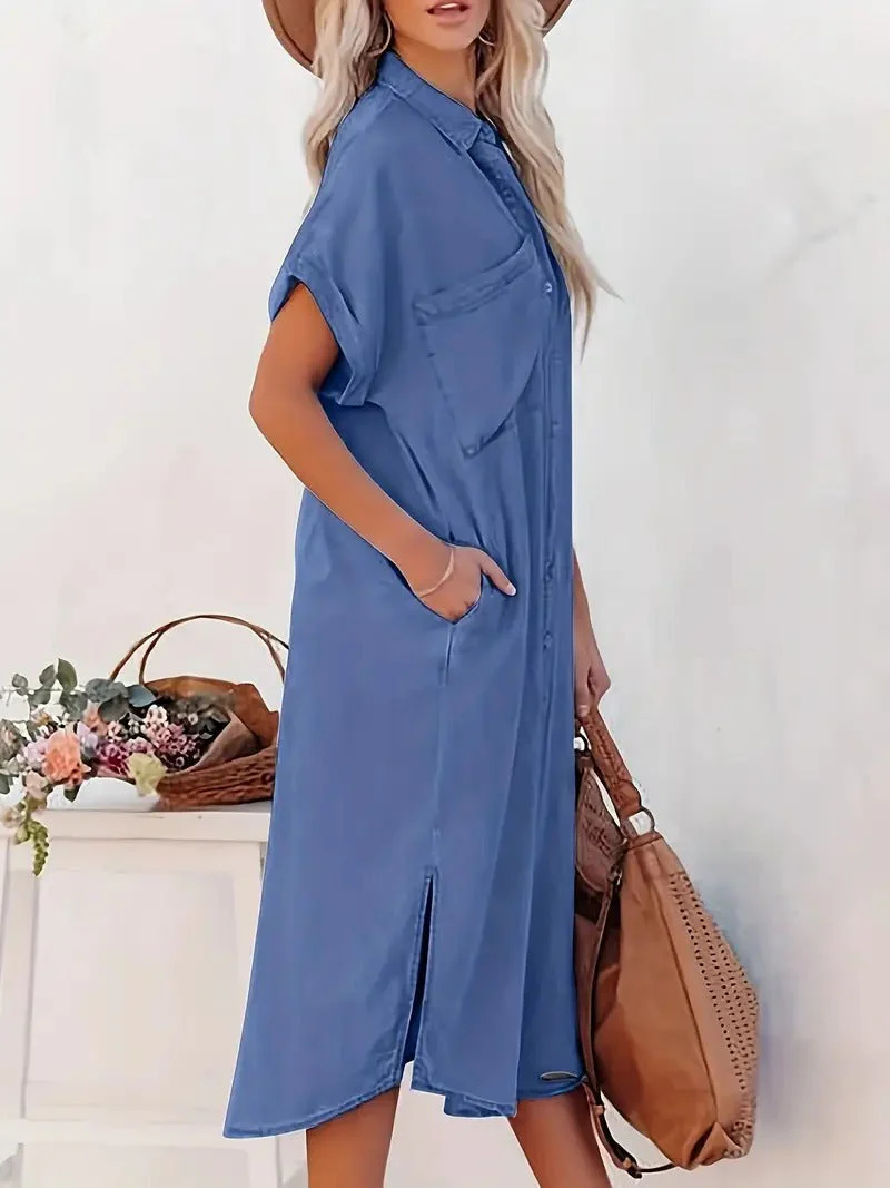 Robe midi à boutons pour femmes – Coupe décontractée – Manches courtes – Col classique – Poches latérales élégantes