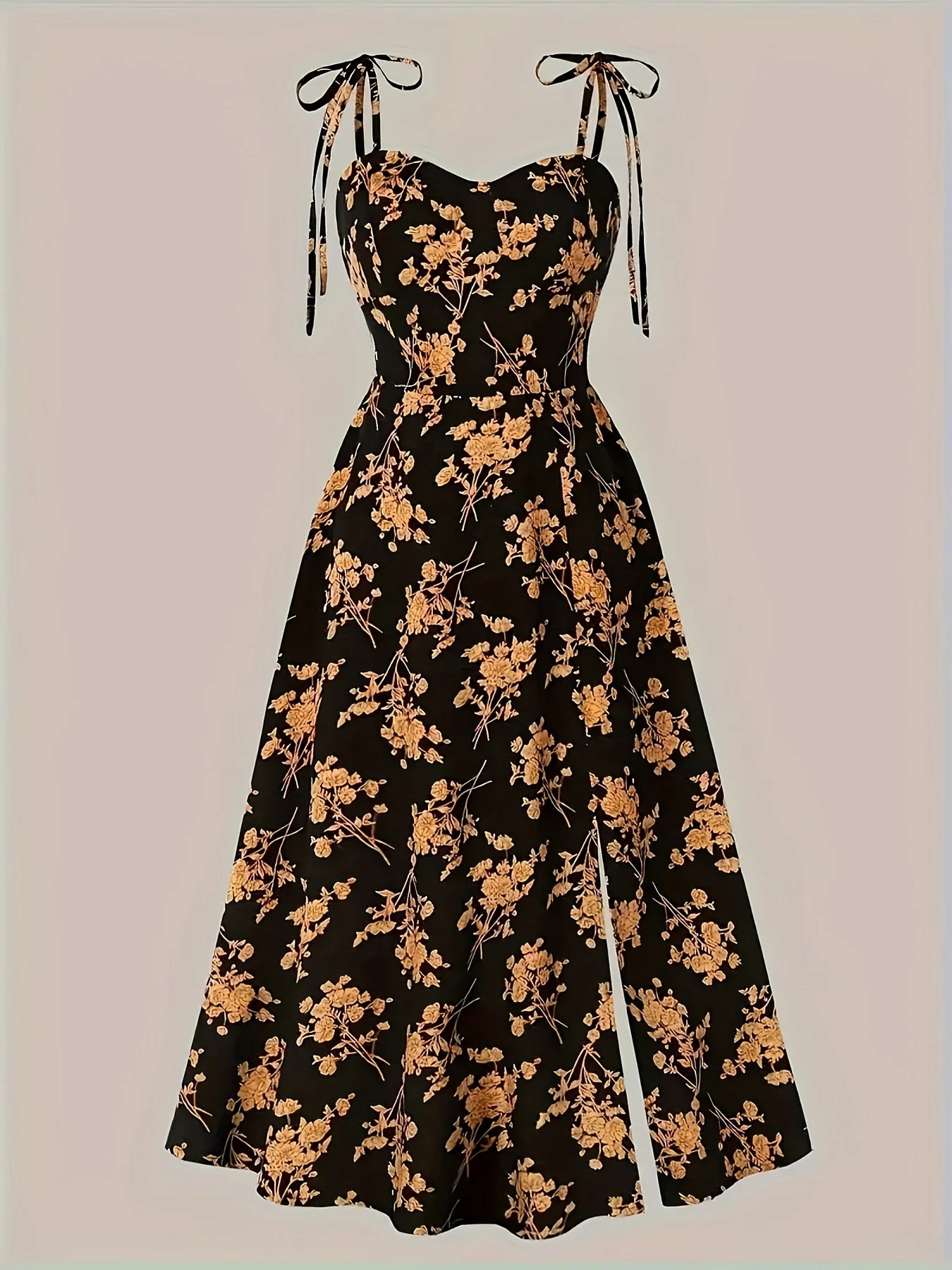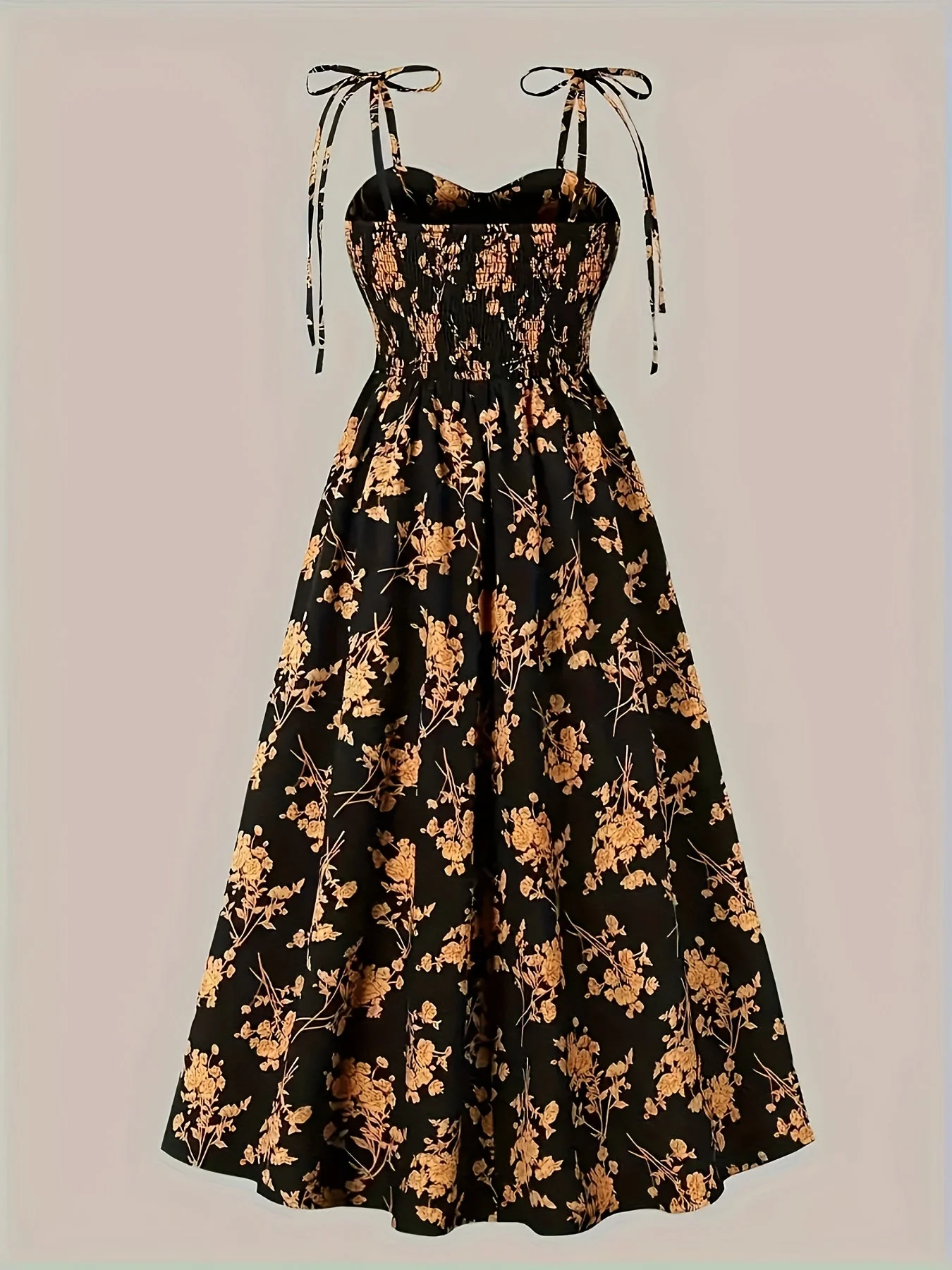 Cette robe midi à imprimé floral est conçue avec un corsage smocké et des bretelles à nouer réglables pour une coupe personnalisée et flatteuse. Sa silhouette fluide et son tissu léger la rendent parfaite pour les sorties de printemps et d’été, des pique-niques aux garden parties. Son design féminin et son charmant motif floral ajoutent une touche de grâce à toutes les occasions. Faites de cette robe votre choix pour un style et un confort sans effort !