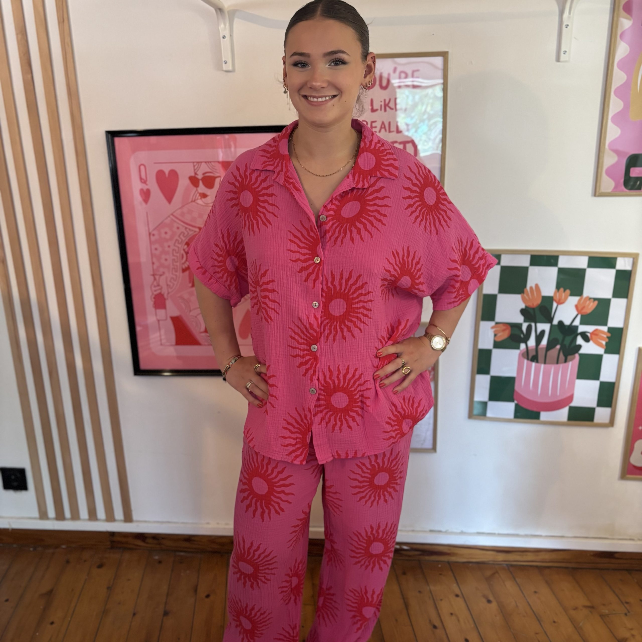 Légère et délicate, cette chemise en gaze de coton fabriquée en Italie est une pièce idéale pour apporter douceur et style à vos tenues. Son motif soleil rose subtil ajoute une touche solaire et féminine, parfaite pour illuminer vos journées, quelle que soit la saison.