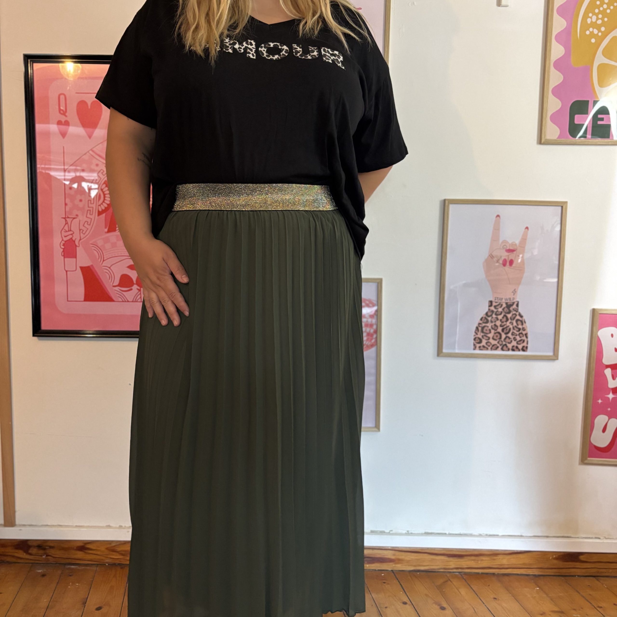 Pour un look chic-décontracté, associez-la à un pull léger et des baskets tendance. Pour une tenue habillée, portez-la avec un chemisier fluide et des escarpins. La jupe plissée Augustine s’adapte à toutes les occasions, du bureau à une soirée élégante, et illumine votre style avec sa ceinture dorée raffinée.