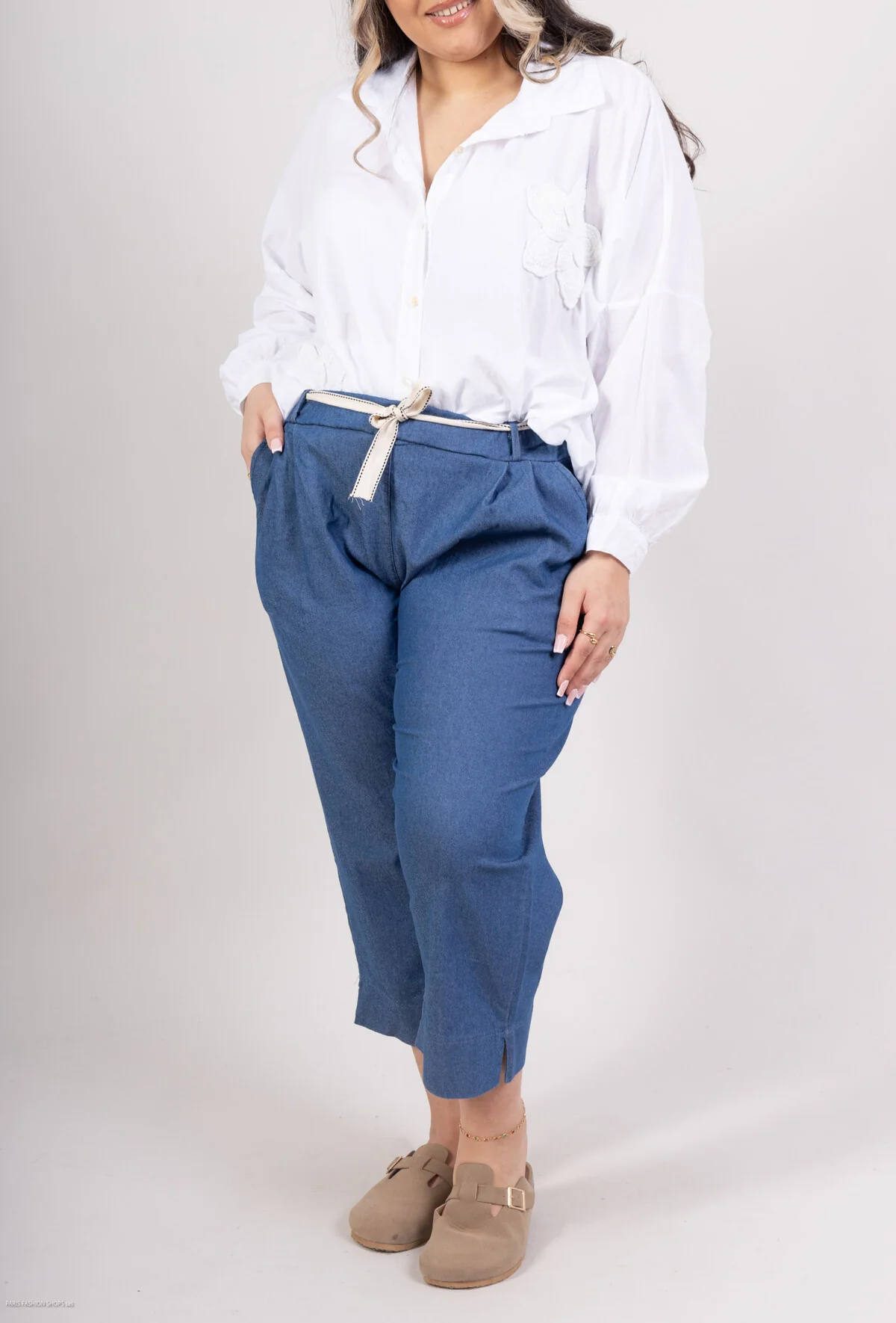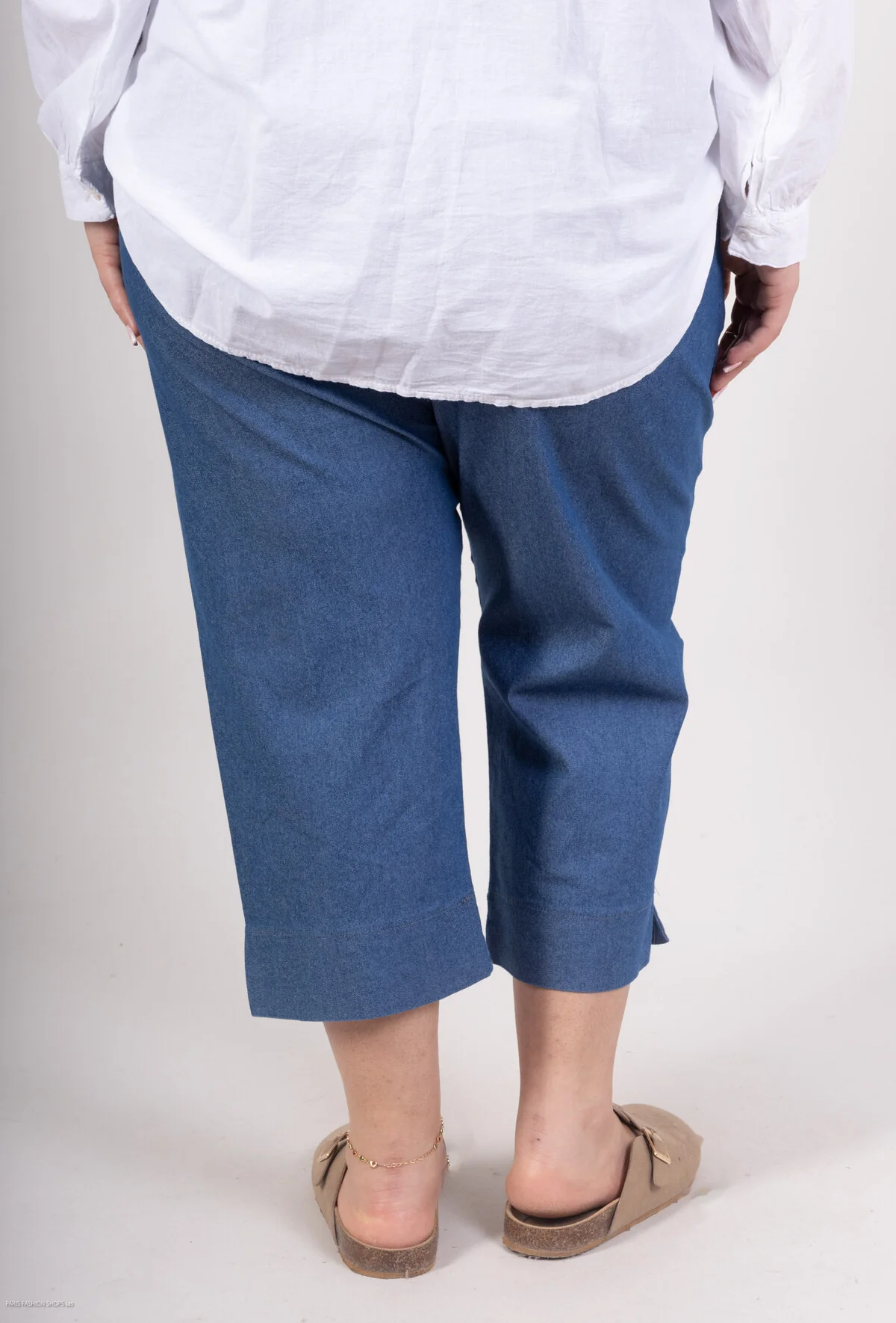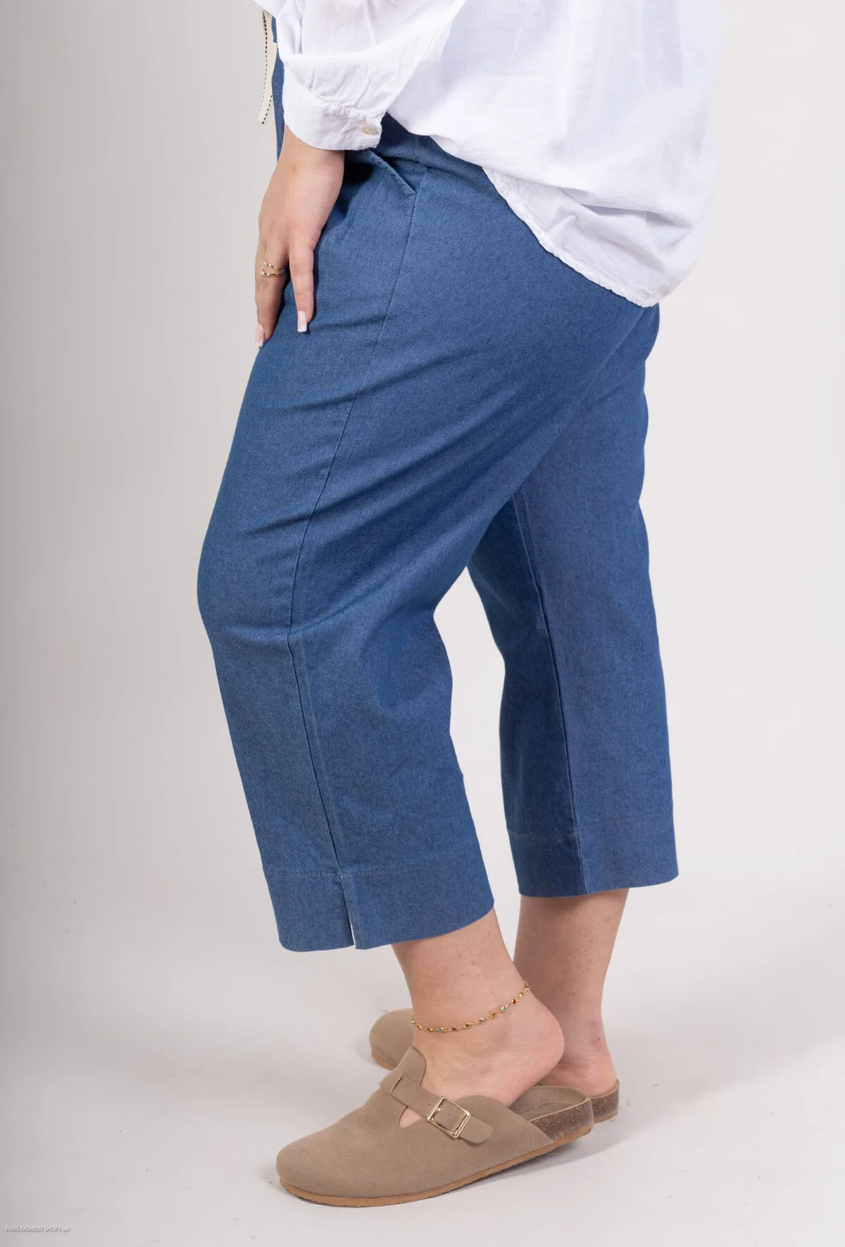 Le pantacourt en jean stretch bleu foncé se distingue par sa coupe 7/8, un choix qui met en valeur les chevilles et allège visuellement la silhouette. Cette longueur raccourcie apporte une touche moderne et élégante, parfaite pour créer des looks aussi bien casual que plus habillés. La petite fente discrète au niveau de l’ourlet ajoute une note féminine et sophistiquée, tout en facilitant les mouvements pour un confort optimal.