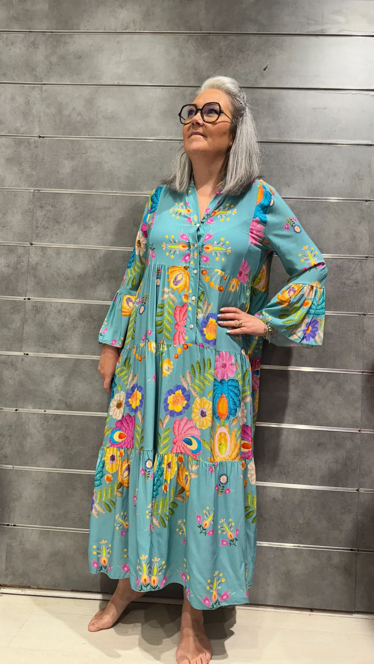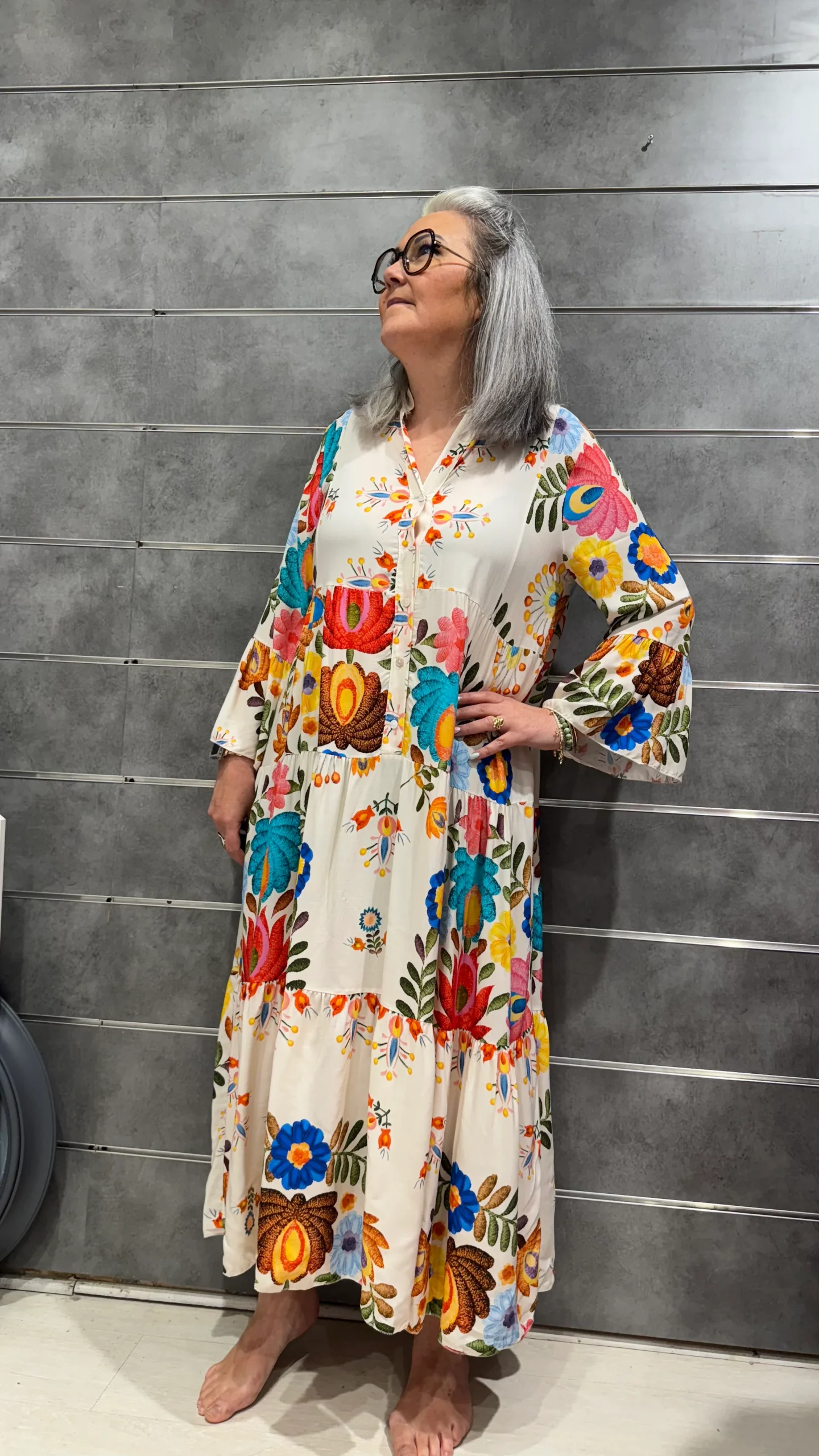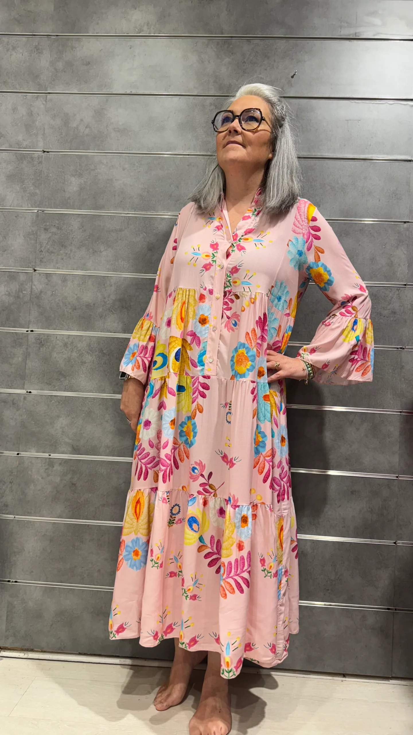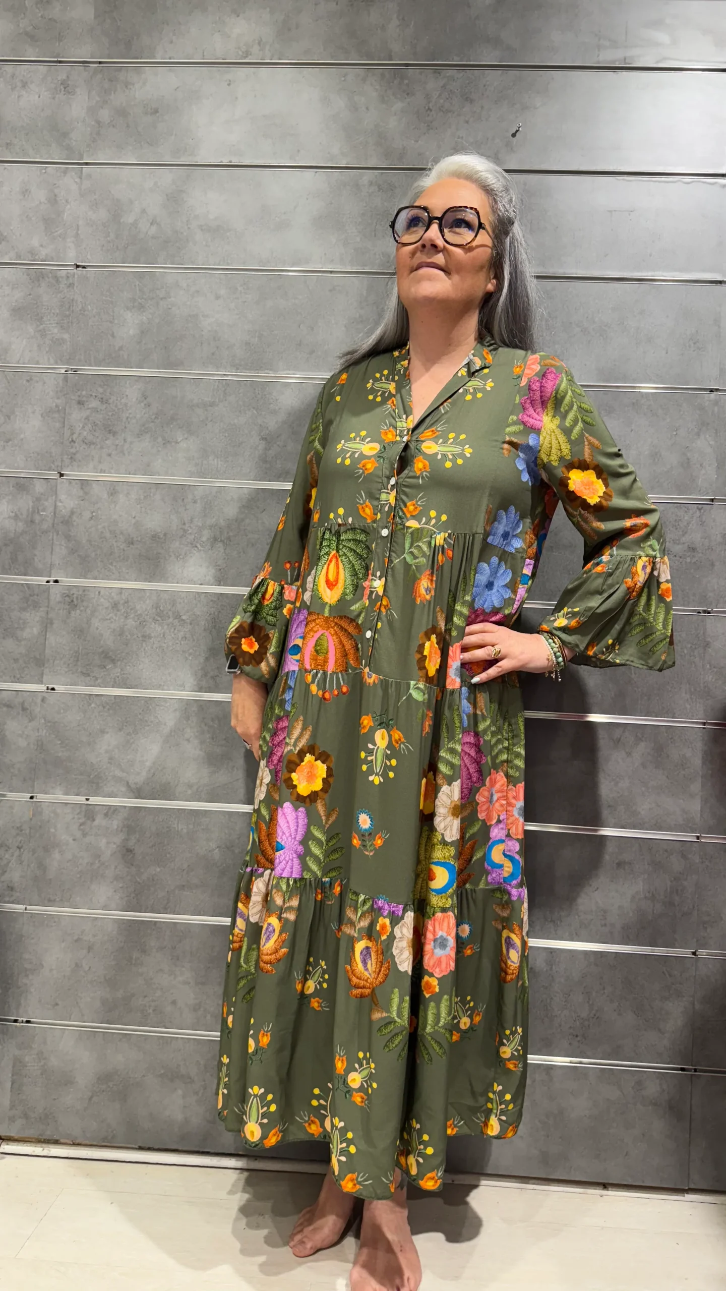 C’est la robe bohème par excellence : longue sans être lourde, ample mais flatteuse, avec ses manches 3/4 légèrement volantées, son col en V boutonné et son tissu tout doux.