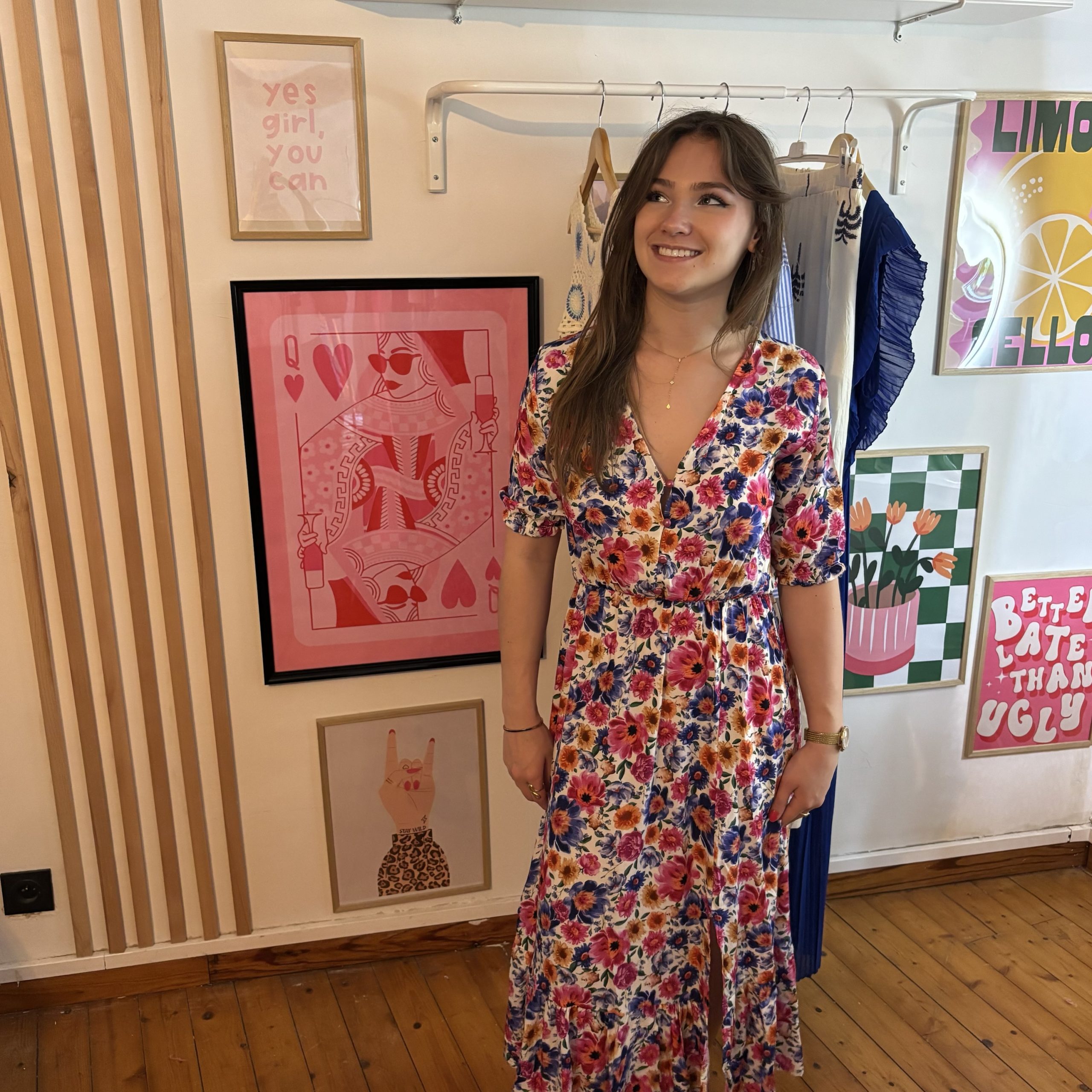 Robe longue imprimée fluide dans une matière 100% Viscose. La robe est composé en 3 tailles (S – M -L).