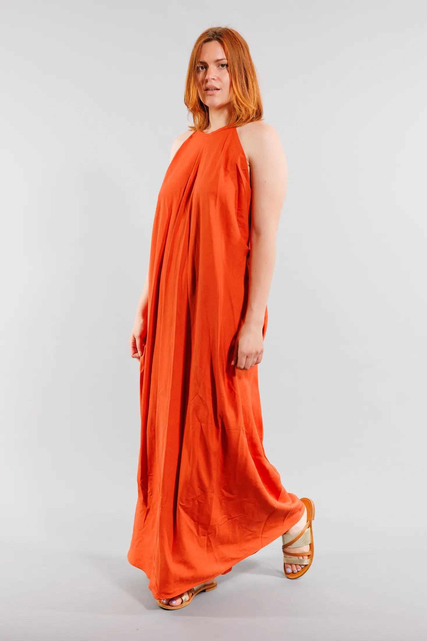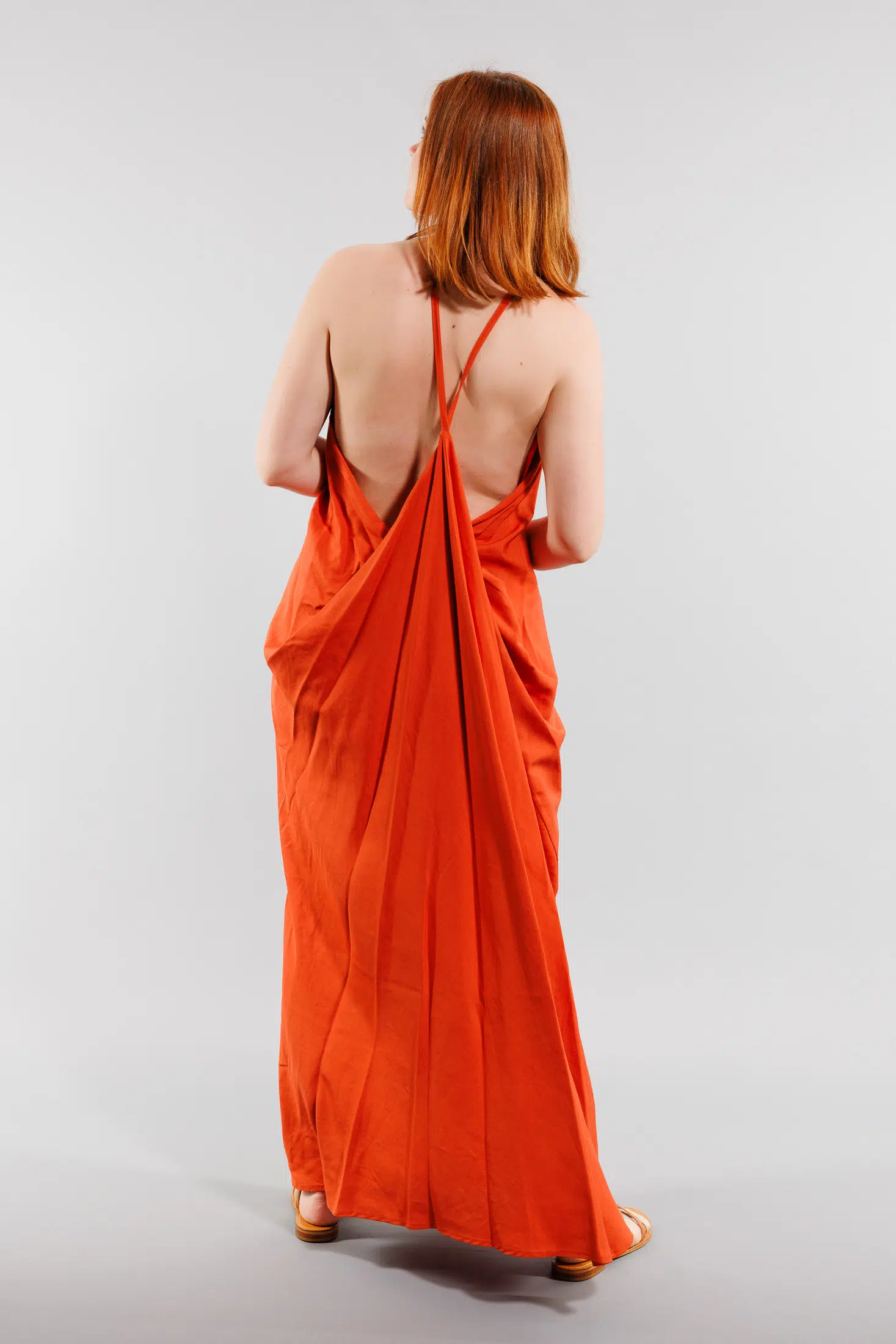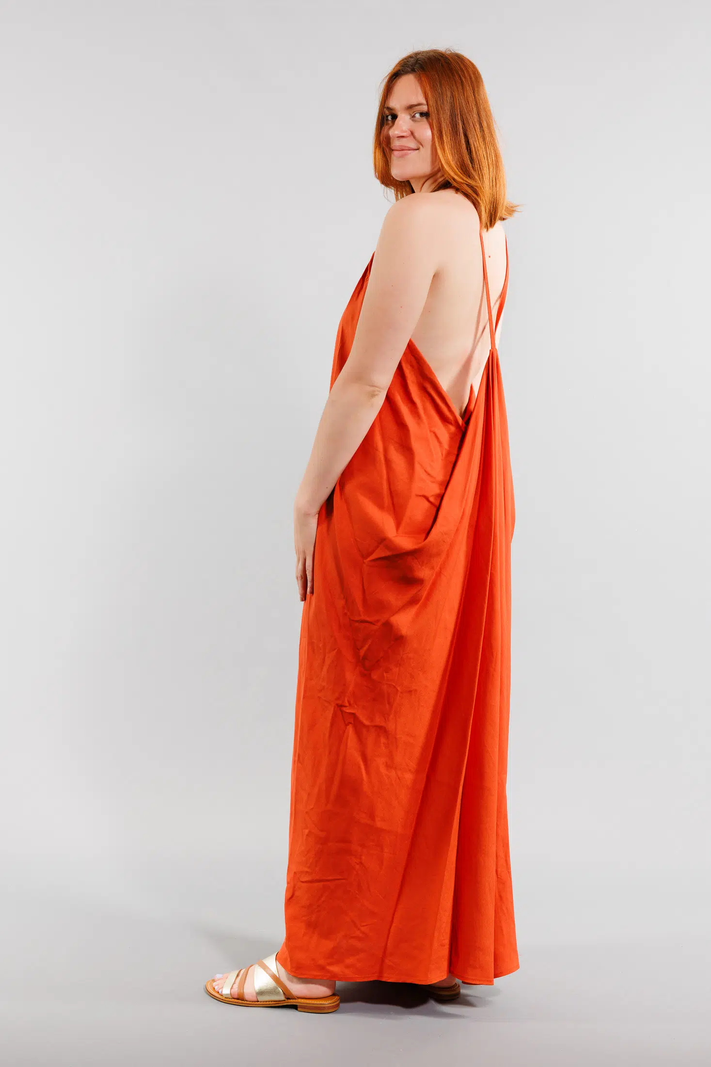 • Cette robe longue à dos nageur séduit par sa teinte orange intense et sa coupe fluide.