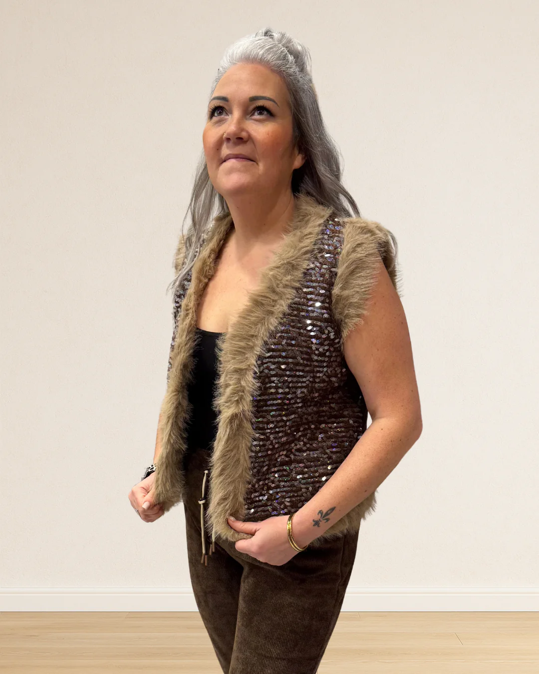Elle se porte aussi bien avec un jean pour casser le côté glitter, qu’avec un pantalon fluide ou une jupe pour une allure ultra chic. Une pièce lumineuse, féminine et terriblement tendance — sans oublier son petit twist cocooning grâce à la fausse fourrure.