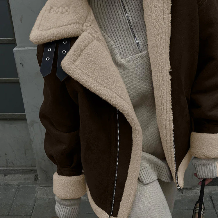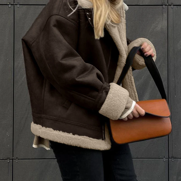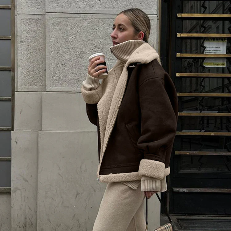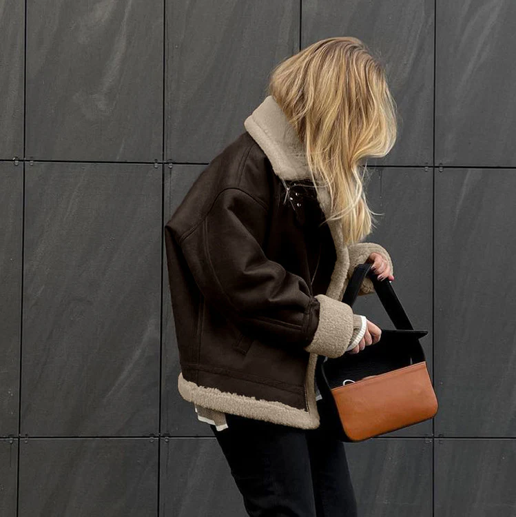 Confectionnée en suède de qualité, cette veste est épaisse et douce, offrant chaleur et confort. Son design à manches longues et coupe ample assure une silhouette détendue tout en restant chic.